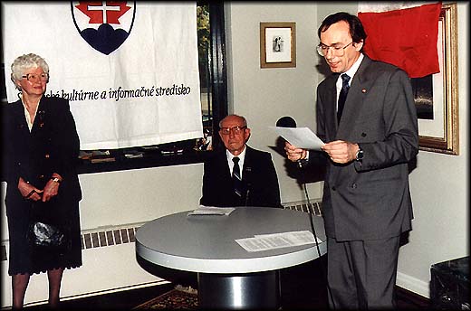 Opening ceremonies speech by Ondro Mihal, President of SCIC, with Mr. Milan Jakubec, author of Na zemi i nad morom and Mrs. Elena Jakubec in the background.