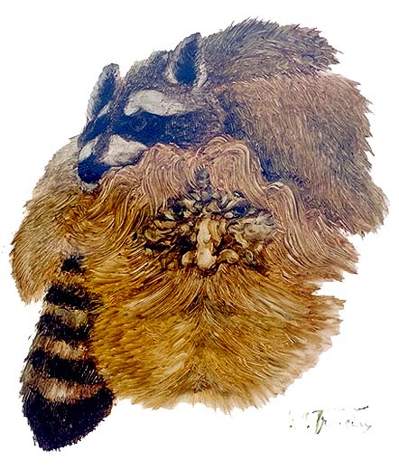 Title: The wary racoon. Date: 1987 Size:24" x 16" (Oil and Finger painting)